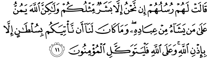 qālat lahum rusuluhum ʾin naḥnu ʾillā basharun mithlukum wa-lākinna llāha yamunnu ʿalā man yashāʾu min ʿibādihī wa-mā kāna lanā ʾan naʾtiyakum bi-sulṭānin ʾillā bi-ʾidhni llāhi wa-ʿalā llāhi fa-l-yatawakkali l-muʾminūna
