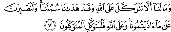 wa-mā lanā ʾallā natawakkala ʿalā llāhi wa-qad hadānā subulanā wa-la-naṣbiranna ʿalā mā ʾādhaytumūnā wa-ʿalā llāhi fa-l-yatawakkali l-mutawakkilūna