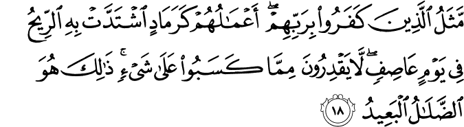 mathalu lladhīna kafarū bi-rabbihim ʾaʿmāluhum ka-ramādin-i shtaddat bihi r-rīhu fī yawmin ʿāṣifin lā yaqdirūna mimmā kasabū ʿalā shayʾin dhālika huwa ḍ-ḍalālu l-baʿīdu