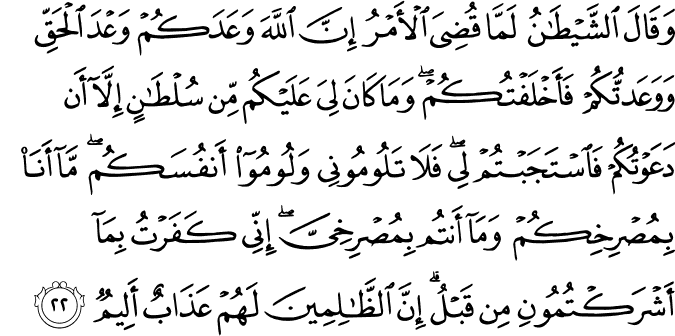 wa-qāla sh-shayṭānu lammā quḍiya l-ʾamru ʾinna llāha waʿadakum waʿda l-ḥaqqi wa-waʿadtukum fa-ʾakhlaftukum wa-mā kāna liya ʿalaykum min sulṭānin ʾillā ʾan daʿawtukum fa-stajabtum lī fa-lā talūmūnī wa-lūmū ʾanfusakum mā ʾana bi-muṣrikhikum wa-mā ʾantum bi-muṣrikhiyya ʾinnī kafartu bi-mā ʾashraktumūni min qablu ʾinna ẓ-ẓālimīna lahum ʿadhābun ʾalīmun