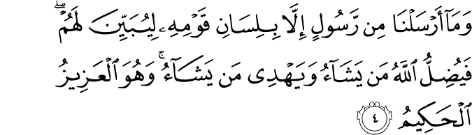 wa-mā ʾarsalnā min rasūlin ʾillā bi-lisāni qawmihī li-yubayyina lahum fa-yuḍillu llāhu man yashāʾu wa-yahdī man yashāʾu wa-huwa l-ʿazīzu l-ḥakīmu