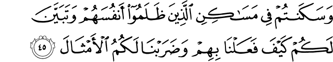 wa-sakantum fī masākini lladhīna ẓalamū ʾanfusahum wa-tabayyana lakum kayfa faʿalnā bihim wa-ḍarabnā lakumu l-ʾamthāla