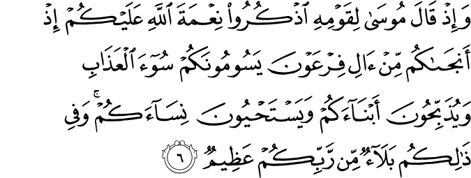 wa-ʾidh qāla mūsā li-qawmihi dhkurū niʿmata llāhi ʿalaykum ʾidh ʾanjākum min ʾāli firʿawna yasūmūnakum sūʾa l-ʿadhābi wa-yudhabbiḥūna ʾabnāʾakum wa-yastaḥyūna nisāʾakum wa-fī dhālikum balāʾun min rabbikum ʿaẓīmun