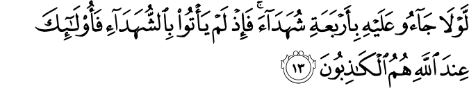 law-lā jāʾū ʿalayhi bi-ʾarbaʿati shuhadāʾa fa-ʾidh lam yaʾtū bi-sh-shuhadāʾi fa-ʾulāʾika ʿinda llāhi humu l-kādhibūna