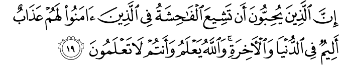 ʾinna lladhīna yuḥibbūna ʾan tashīʿa l-fāḥishatu fī lladhīna ʾāmanū lahum ʿadhābun ʾalīmun fī d-dunyā wa-l-ʾākhirati wa-llāhu yaʿlamu wa-ʾantum lā taʿlamūna