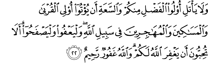 wa-lā yaʾtali ʾulū l-faḍli minkum wa-s-saʿati ʾan yuʾtū ʾulī l-qurbā wa-l-masākīna wa-l-muhājirīna fī sabīli llāhi wa-l-yaʿfū wa-l-yaṣfaḥū ʾa-lā tuḥibbūna ʾan yaghfira llāhu lakum wa-llāhu ghafūrun raḥīmun