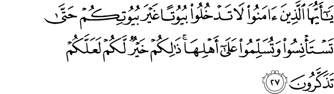 yā-ʾayyuhā lladhīna ʾāmanū lā tadkhulū buyūtan ghayra buyūtikum ḥattā tastaʾnisū wa-tusallimū ʿalā ʾahlihā dhālikum khayrun lakum laʿallakum tadhakkarūna