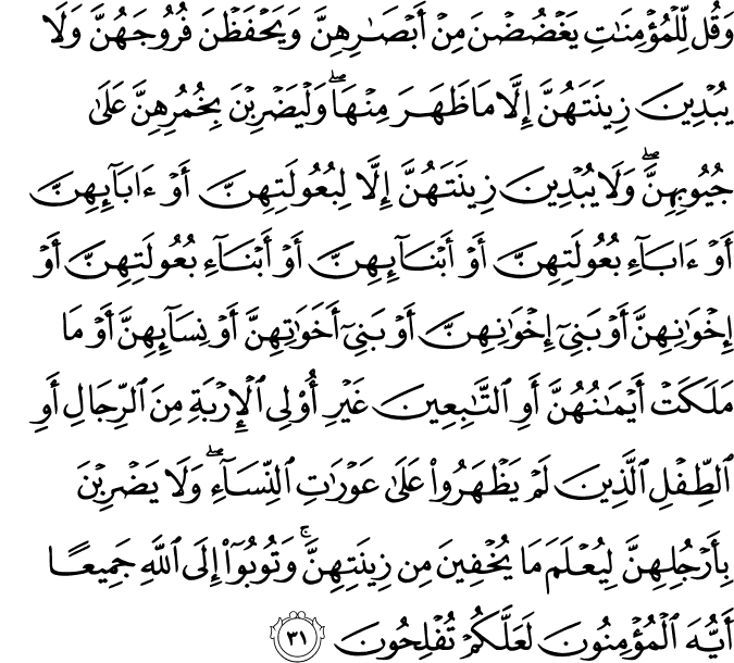 wa-qul li-l-muʾmināti yaghḍuḍna min ʾabṣārihinna wa-yaḥfaẓna furūjahunna wa-lā yubdīna zīnatahunna ʾillā mā ẓahara minhā wa-l-yaḍribna bi-khumurihinna ʿalā juyūbihinna wa-lā yubdīna zīnatahunna ʾillā li-buʿūlatihinna ʾaw ʾābāʾihinna ʾaw ʾābāʾi buʿūlatihinna ʾaw ʾabnāʾihinna ʾaw ʾabnāʾi buʿūlatihinna ʾaw ʾikhwānihinna ʾaw banī ʾikhwānihinna ʾaw banī ʾakhawātihinna ʾaw nisāʾihinna ʾaw mā malakat ʾaymānuhunna ʾawi t-tābiʿīna ghayri ʾulī l-ʾirbati mina r-rijāli ʾawi ṭ-ṭifli lladhīna lam yaẓharū ʿalā ʿawrāti n-nisāʾi wa-lā yaḍribna bi-ʾarjulihinna li-yuʿlama mā yukhfīna min zīnatihinna wa-tūbū ʾilā llāhi jamīʿan ʾayyuha l-muʾminūna laʿallakum tufliḥūna