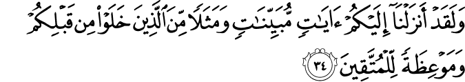 wa-la-qad ʾanzalnā ʾilaykum ʾāyātin mubayyinātin wa-mathalan mina lladhīna khalaw min qablikum wa-mawʿiẓatan li-l-muttaqīna