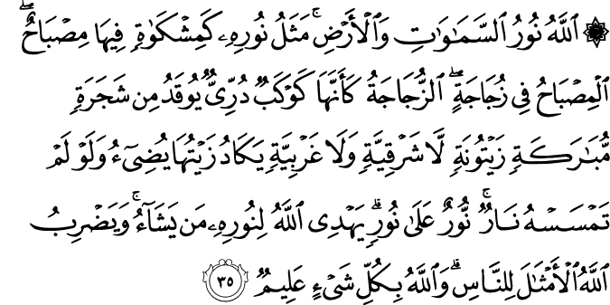 allāhu nūru s-samāwāti wa-l-ʾarḍi mathalu nūrihī ka-mishkātin fīhā miṣbāḥun-i l-miṣbāḥu fī zujājatin-i z-zujājatu ka-ʾannahā kawkabun durriyyun yūqadu min shajaratin mubārakatin zaytūnatin lā sharqiyyatin wa-lā gharbiyyatin yakādu zaytuhā yuḍīʾu wa-law-lam tamsashu nārun nūrun ʿalā nūrin yahdī llāhu li-nūrihī man yashāʾu wa-yaḍribu llāhu l-ʾamthāla li-n-nāsi wa-llāhu bi-kulli shayʾin ʿalīmun