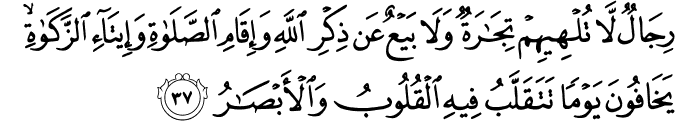 rijālun lā tulhīhim tijāratun wa-lā bayʿun ʿan dhikri llāhi wa-ʾiqāmi ṣ-ṣalāti wa-ʾītāʾi z-zakāti yakhāfūna yawman tataqallabu fīhi l-qulūbu wa-l-ʾabṣāru