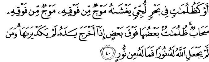 ʾaw ka-ẓulumātin fī baḥrin lujjiyyin yaghshāhu mawjun min fawqihī mawjun min fawqihī saḥābun ẓulumātun baʿḍuhā fawqa baʿḍin ʾidhā ʾakhraja yadahū lam yakad yarāhā wa-man lam yajʿali llāhu lahū nūran fa-mā lahū min nūrin