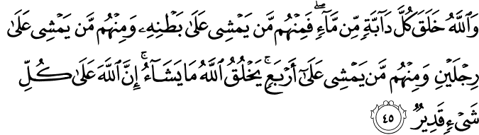 wa-llāhu khalaqa kulla dābbatin min māʾin fa-minhum man yamshī ʿalā baṭnihī wa-minhum man yamshī ʿalā rijlayni wa-minhum man yamshī ʿalā ʾarbaʿin yakhluqu llāhu mā yashāʾu ʾinna llāha ʿalā kulli shayʾin qadīrun