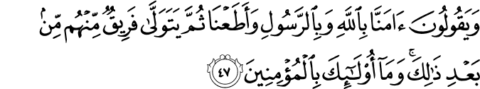 wa-yaqūlūna ʾāmannā bi-llāhi wa-bi-r-rasūli wa-ʾaṭaʿnā thumma yatawallā farīqun minhum min baʿdi dhālika wa-mā ʾulāʾika bi-l-muʾminīna