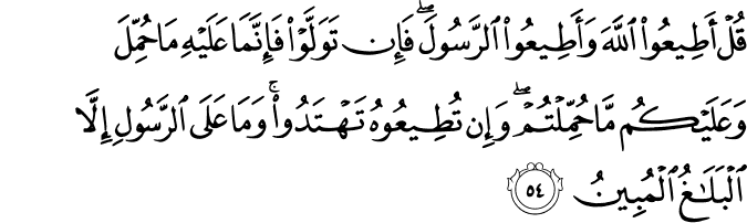 qul ʾaṭīʿū llāha wa-ʾaṭīʿū r-rasūla fa-ʾin tawallaw fa-ʾinnamā ʿalayhi mā ḥummila wa-ʿalaykum mā ḥummiltum wa-ʾin tuṭīʿūhu tahtadū wa-mā ʿalā r-rasūli ʾillā l-balāghu l-mubīnu