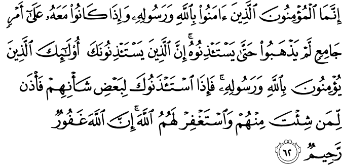 ʾinnamā l-muʾminūna lladhīna ʾāmanū bi-llāhi wa-rasūlihī wa-ʾidhā kānū maʿahū ʿalā ʾamrin jāmiʿin lam yadhhabū ḥattā yastaʾdhinūhu ʾinna lladhīna yastaʾdhinūnaka ʾulāʾika lladhīna yuʾminūna bi-llāhi wa-rasūlihī fa-ʾidhā staʾdhanūka li-baʿḍi shaʾnihim fa-ʾdhan li-man shiʾta minhum wa-staghfir lahumu llāha ʾinna llāha ghafūrun raḥīmun