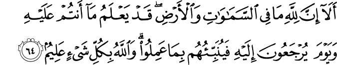 ʾa-lā ʾinna li-llāhi mā fī s-samāwāti wa-l-ʾarḍi qad yaʿlamu mā ʾantum ʿalayhi wa-yawma yurjaʿūna ʾilayhi fa-yunabbiʾuhum bi-mā ʿamilū wa-llāhu bi-kulli shayʾin ʿalīmun