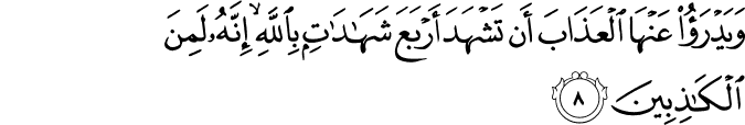 wa-yadraʾu ʿanhā l-ʿadhāba ʾan tashhada ʾarbaʿa shahādātin bi-llāhi ʾinnahū la-mina l-kādhibīna