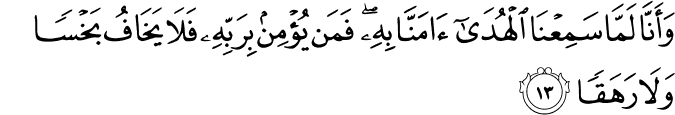 wa-ʾannā lammā samiʿnā l-hudā ʾāmannā bihī fa-man yuʾmin bi-rabbihī fa-lā yakhāfu bakhsan wa-lā rahaqan