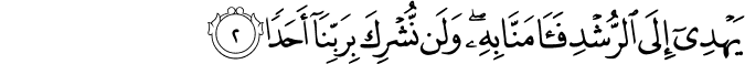 yahdī ʾilā r-rushdi fa-ʾāmannā bihī wa-lan nushrika bi-rabbinā ʾaḥadan