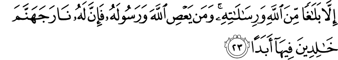 ʾillā balāghan mina llāhi wa-risālātihī wa-man yaʿṣi llāha wa-rasūlahū fa-ʾinna lahū nāra jahannama khālidīna fīhā ʾabadan