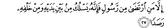 ʾillā mani rtaḍā min rasūlin fa-ʾinnahū yasluku min bayni yadayhi wa-min khalfihī raṣadan